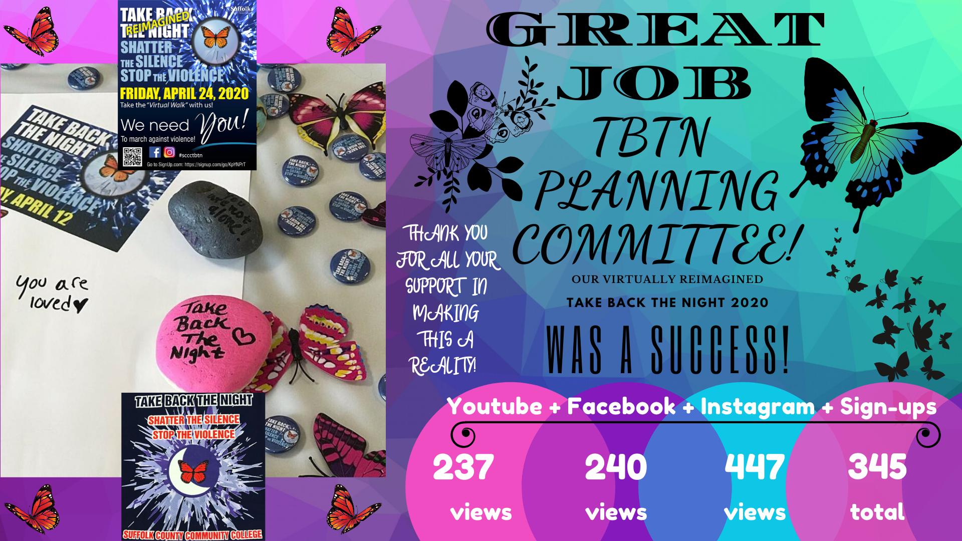 Take Back the Night: Reimagined that took place on April 24 at 7:00 p.m. was the ultimate success! This is the first time we have ever done this virtually. This was live streaned on YouTube, Facebook and Instagram. I am attaching a flyer which sums up our success as well as a thank you flyer from our committee for all that participated. Special thanks to Gina Ocello, Adjunct Professor of Reading who managed our YouTube page as well as student leader Leila Baugh who managed our Instagram page. The actual program is still on all our social media sites if anybody missed it.