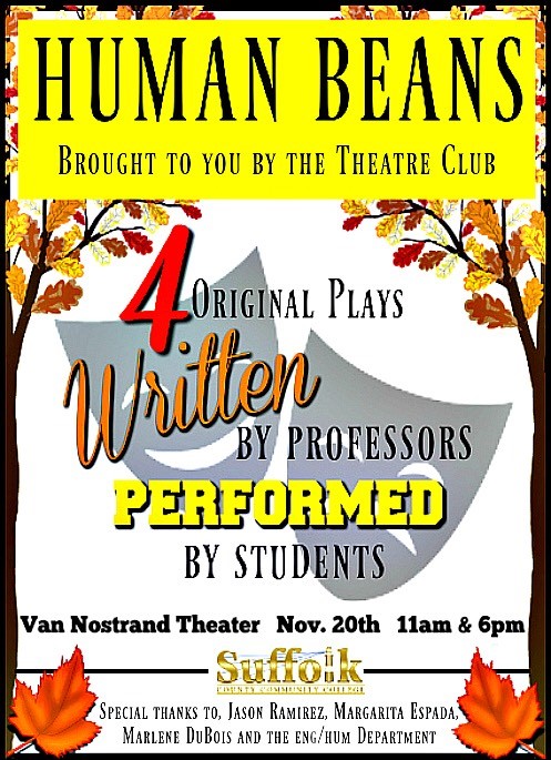 Human Beans - Brougth to you by the Theatre Club. 4 Original Plays written by professors, performed by students. Van Nostrand Theater, November 20, 2017, 11 a.m. and 6 p.m. Special thanks to Jason Ramirez, Margarita Espada, Marlene DuBois and the English and Humanities Department.
